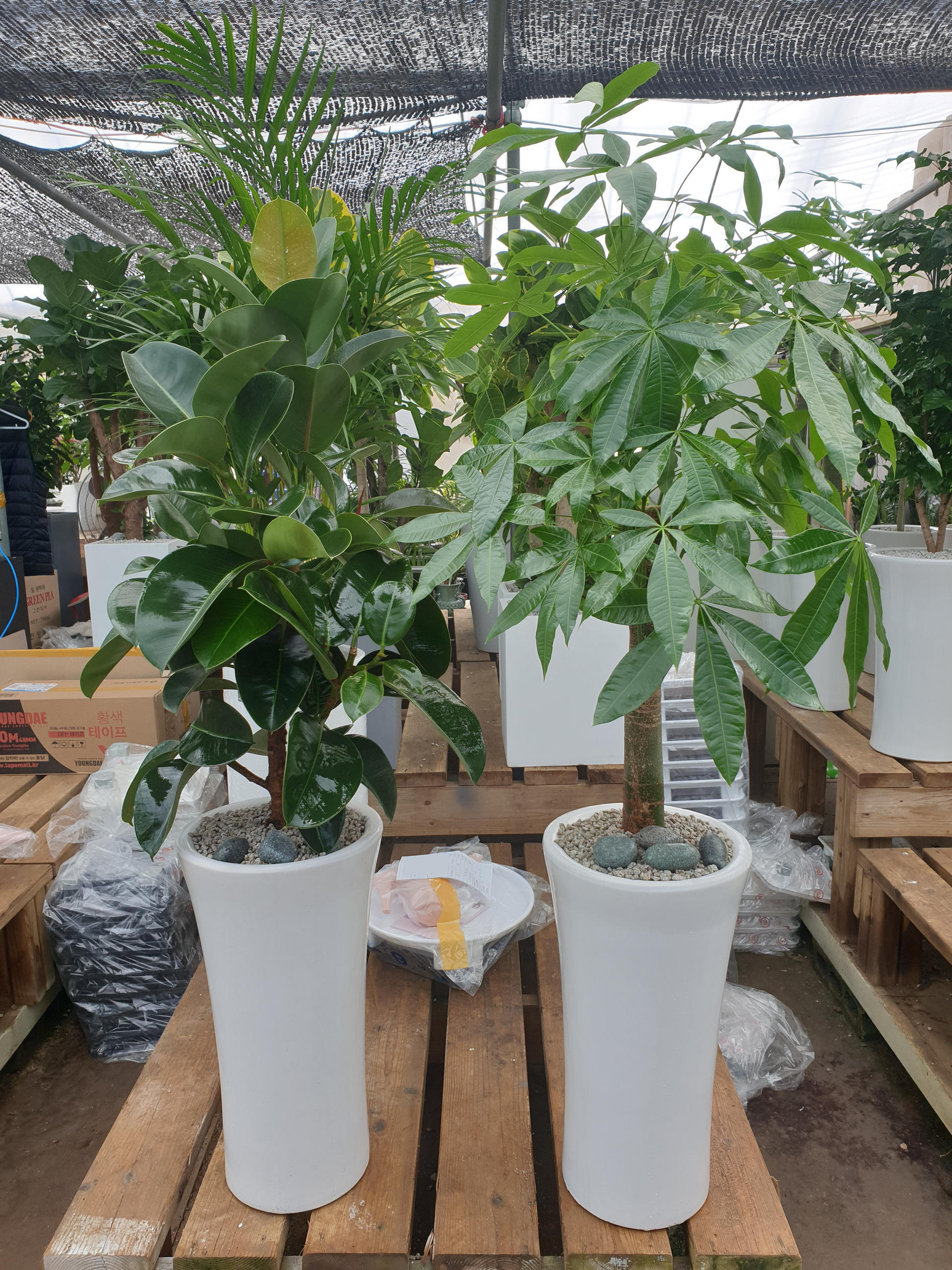 깔끔한 도자기 화분에 식재한 고무나무와 파키라💚
